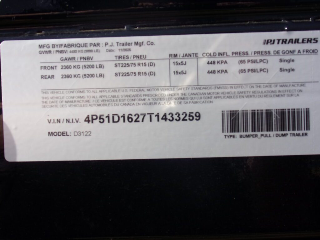(#9149) 2026 PJ TANDEM AXLE DUMP 72″ X 12′ MODEL D3122 SUGGESTED RETAIL PRICE $11,553 REDUCED CREDIT CARD PRICE $10,728 FURTHER REDUCED CASH PRICE $10,315